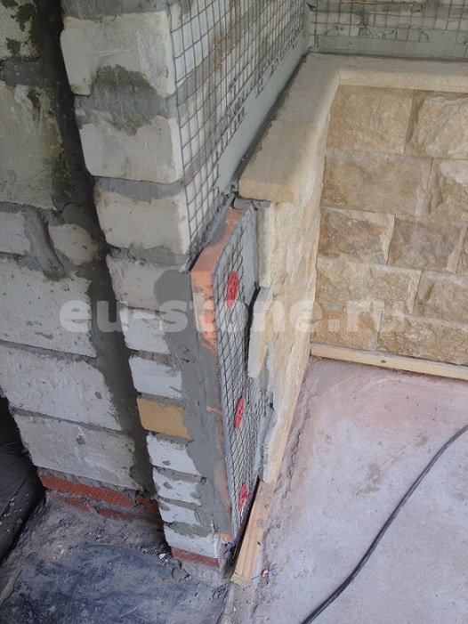 Отделка цоколя натуральным камнем осуществляется поэтапно.- Сначала поверхность тщательно очищается. На нее наносится слой грунтовки.